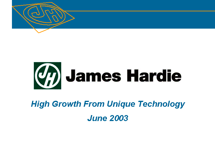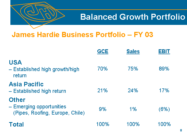 | Balanced Growth Portfolio James Hardie Business Portfolio - FY 03 GCE Sales EBIT USA - - Established high growth/high return 70% 75% 89% Asia Pacific - - Established high return 21% 24% 17% Other - - Emerging opportunities (Pipes, Roofing, Europe, Chile) 9% 1% (6%) Total 100% 100% 100% |