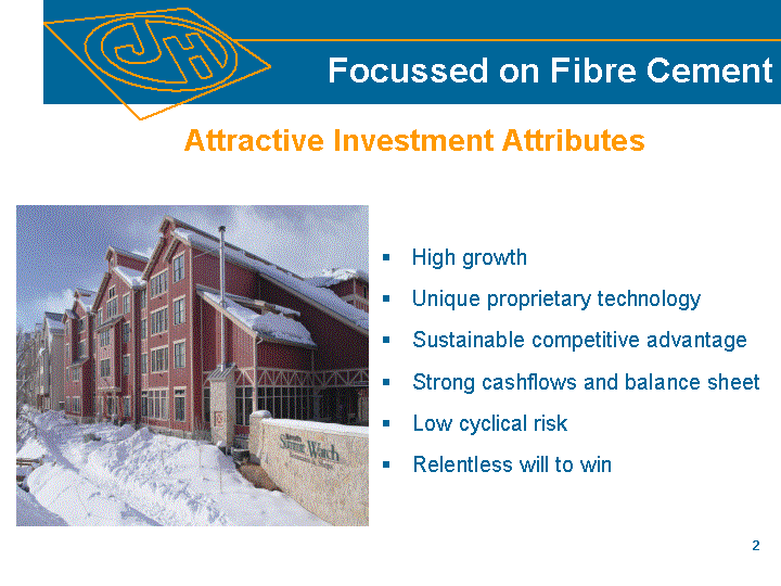 | Focussed on Fibre Cement High growth Unique proprietary technology Sustainable competitive advantage Strong cashflows and balance sheet Low cyclical risk Relentless will to win Attractive Investment Attributes |