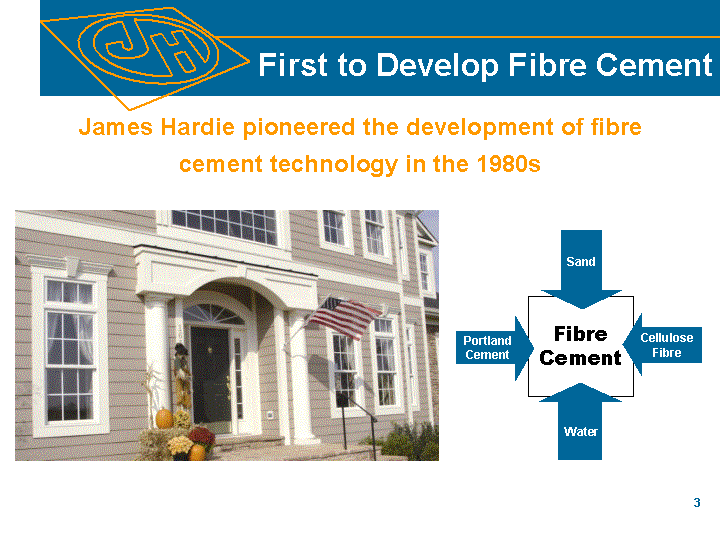 | First to Develop Fibre Cement James Hardie pioneered the development of fibre cement technology in the 1980s Fibre Cement Sand Cellulose Fibre Water Portland Cement |