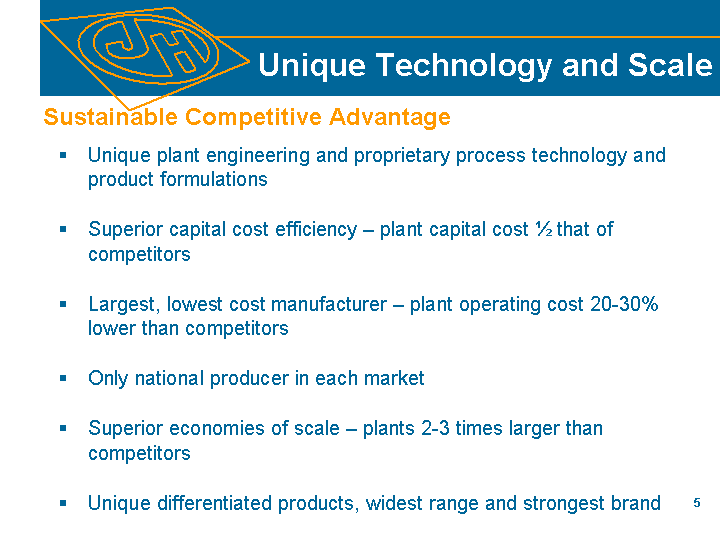 | Unique Technology and Scale Sustainable Competitive Advantage Unique plant engineering and proprietary process technology and product formulations Superior capital cost efficiency - plant capital cost 1/2 that of competitors Largest, lowest cost manufacturer - plant operating cost 20-30% lower than competitors Only national producer in each market Superior economies of scale - plants 2-3 times larger than competitors Unique differentiated products, widest range and strongest brand |
