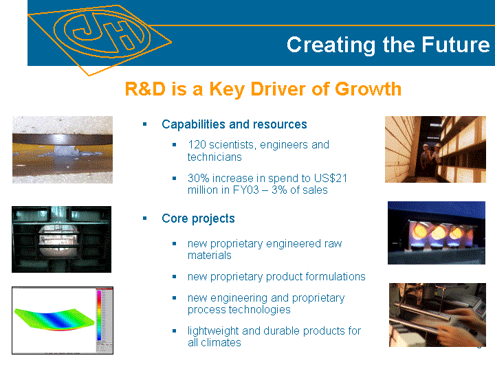 | Capabilities and resources 120 scientists, engineers and technicians 30% increase in spend to US$21 million in FY03 - 3% of sales Core projects new proprietary engineered raw materials new proprietary product formulations new engineering and proprietary process technologies lightweight and durable products for all climates Creating the Future R&D is a Key Driver of Growth |