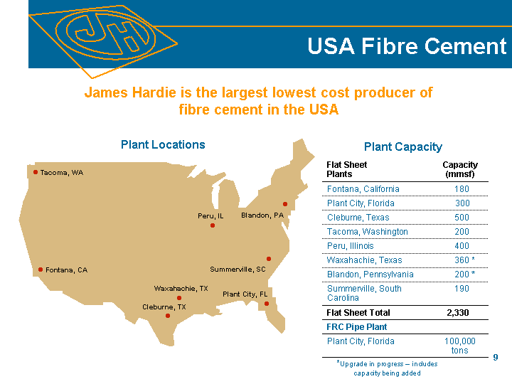 | USA Fibre Cement James Hardie is the largest lowest cost producer of fibre cement in the USA Plant Locations Flat Sheet Plants Capacity (mmsf) Fontana, California 180 Plant City, Florida 300 Cleburne, Texas 500 Tacoma, Washington 200 Peru, Illinois 400 Waxahachie, Texas 360 * Blandon, Pennsylvania 200 * Summerville, South Carolina 190 Flat Sheet Total 2,330 FRC Pipe Plant Plant City, Florida 100,000 tons Plant Capacity *Upgrade in progress - includes capacity being added Tacoma, WA Fontana, CA Plant City, FL Waxahachie, TX Cleburne, TX Peru, IL Blandon, PA Summerville, SC |