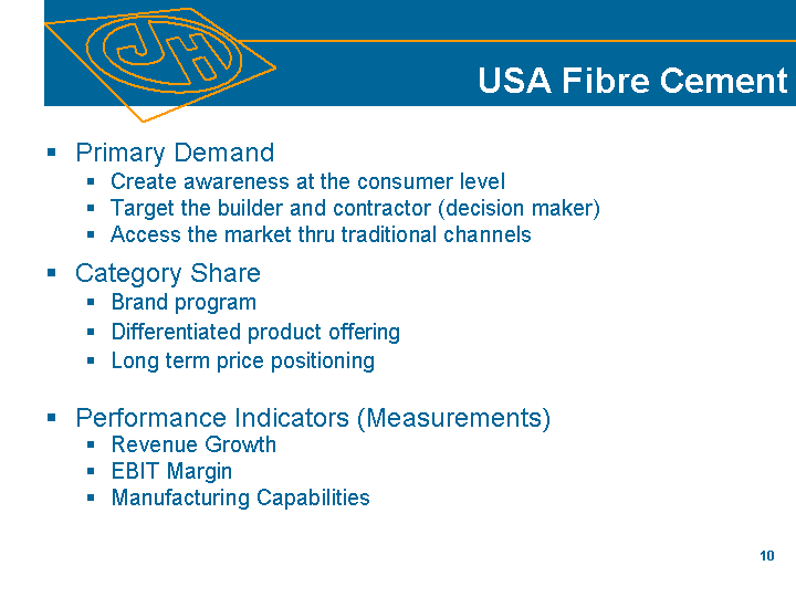 | USA Fibre Cement Primary Demand Create awareness at the consumer level Target the builder and contractor (decision maker) Access the market thru traditional channels Category Share Brand program Differentiated product offering Long term price positioning Performance Indicators (Measurements) Revenue Growth EBIT Margin Manufacturing Capabilities |