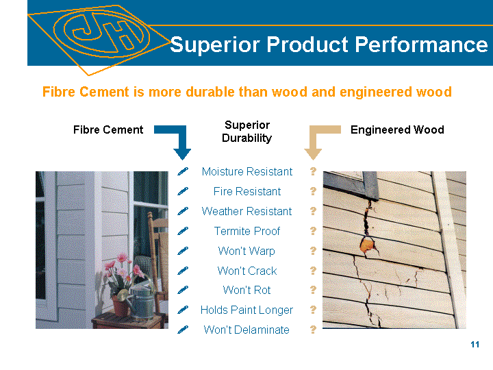 | Superior Product Performance Fibre Cement is more durable than wood and engineered wood Fibre Cement Superior Durability Moisture Resistant Fire Resistant Weather Resistant Termite Proof Won't Warp Won't Crack Won't Rot Holds Paint Longer Won't Delaminate ? ? ? ? ? ? ? ? ? ? ? ? ? ? ? ? ? ? Engineered Wood |