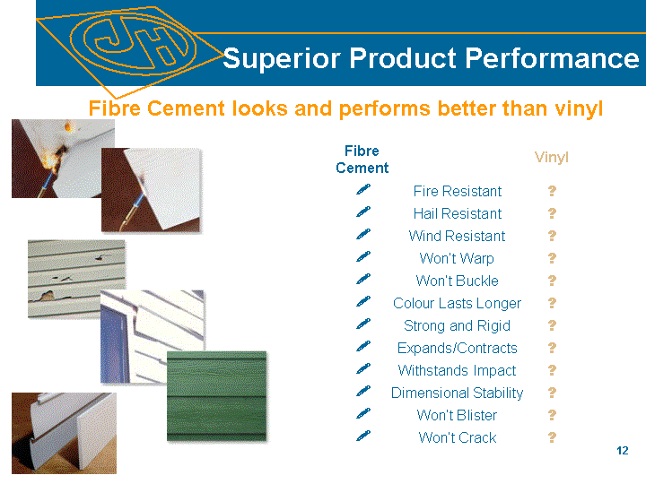| Superior Product Performance Fibre Cement looks and performs better than vinyl Vinyl Fire Resistant Hail Resistant Wind Resistant Won't Warp Won't Buckle Colour Lasts Longer Strong and Rigid Expands/Contracts Withstands Impact Dimensional Stability Won't Blister Won't Crack ? ? ? ? ? ? ? ? ? ? ? ? ? ? ? ? ? ? ? ? ? ? ? ? Fibre Cement |