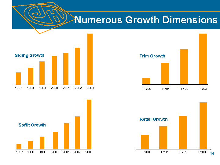 | Numerous Growth Dimensions Soffit Growth 1997 1998 1999 2000 2001 2002 2003 FY00 FY01 FY02 FY03 Retail Growth 1997 1998 1999 2000 2001 2002 2003 Siding Growth Trim Growth FY00 FY01 FY02 FY03 |