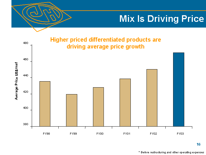 | Mix Is Driving Price * Before restructuring and other operating expenses Average Price US$/msf 380 400 420 440 460 480 FY98 FY99 FY00 FY01 FY02 FY03 Higher priced differentiated products are driving average price growth |