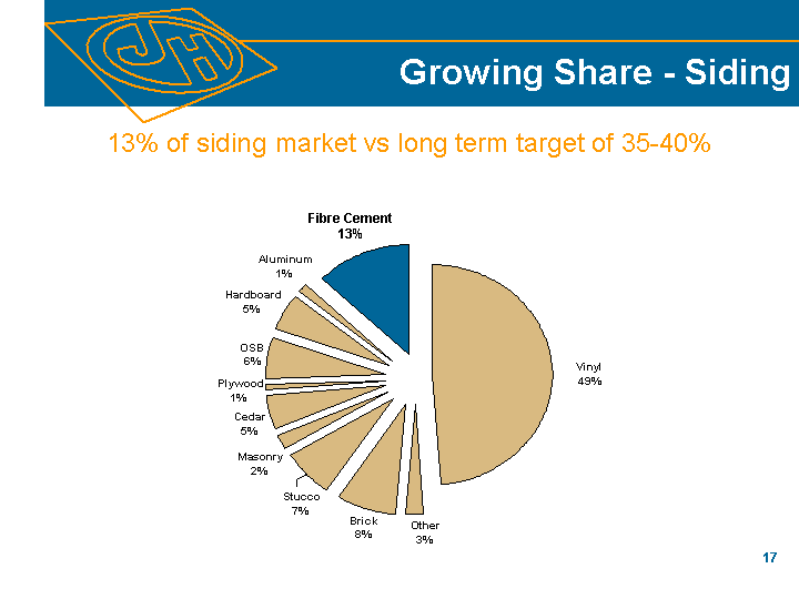 | Growing Share - Siding 13% of siding market vs long term target of 35-40% Vinyl 49% Plywood 1% OSB 6% Hardboard 5% Aluminum 1% Stucco 7% Cedar 5% Masonry 2% Fibre Cement 13% Brick 8% Other 3% |