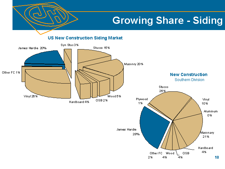 | Growing Share - Siding Masonary Plywood Aluminum 4% 2% New Construction Southern Division Vinyl 10% 21% Wood 1% Other FC Stucco 26% 28% 0% Hardboard 4% OSB 4% James Hardie US New Construction Siding Market Stucco 15% Masonry 20% Wood 5% OSB 2% Hardboard 4% Vinyl 26% Other FC 1% James Hardie 20% Syn Stuc 3% |