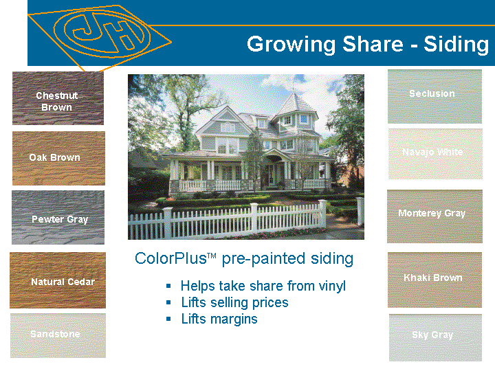 | Growing Share - Siding Sky Gray Natural Cedar Oak Brown Pewter Gray Chestnut Brown Sandstone Khaki Brown Monterey Gray Seclusion Sky Gray ColorPlusTM pre-painted siding Helps take share from vinyl Lifts selling prices Lifts margins |