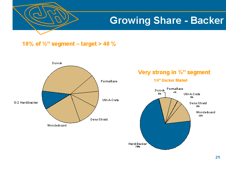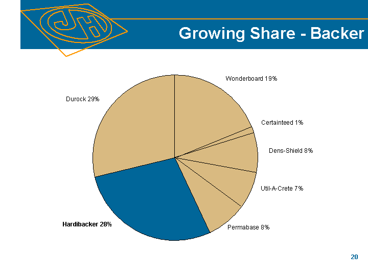 | Growing Share - Backer Wonderboard 19% Certainteed 1% Dens-Shield 8% Util-A-Crete 7% Permabase 8% Hardibacker 28% Durock 29% |