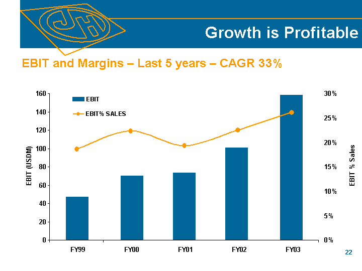 | 0 20 40 60 80 100 120 140 160 FY99 FY00 FY01 FY02 FY03 EBIT (USDM) 0% 5% 10% 15% 20% 25% 30% EBIT % Sales EBIT EBIT% SALES EBIT and Margins - Last 5 years - CAGR 33% Growth is Profitable |