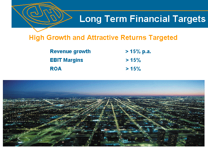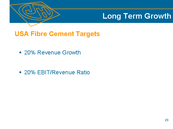 | Long Term Growth USA Fibre Cement Targets 20% Revenue Growth 20% EBIT/Revenue Ratio |