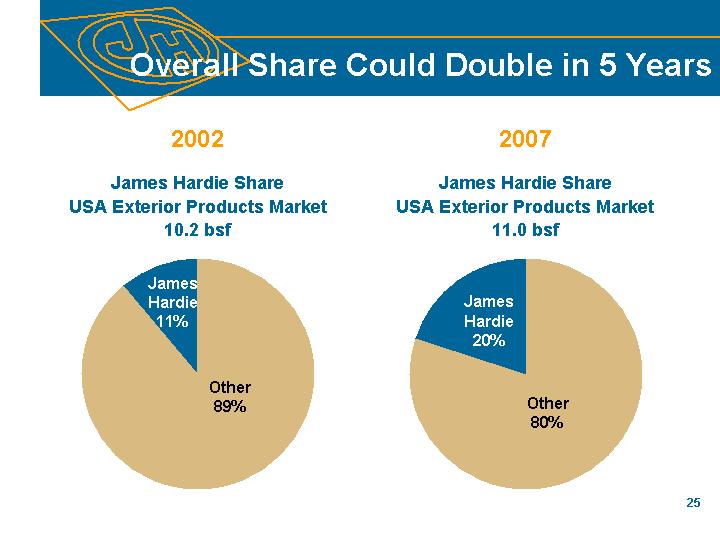 | Overall Share Could Double in 5 Years 2002 James Hardie Share USA Exterior Products Market 10.2 bsf 2007 James Hardie Share USA Exterior Products Market 11.0 bsf James Hardie 11% Other 89% James Hardie 20% Other 80% |