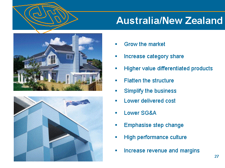 | Australia/New Zealand Grow the market Increase category share Higher value differentiated products Flatten the structure Simplify the business Lower delivered cost Lower SG&A Emphasise step change High performance culture Increase revenue and margins |