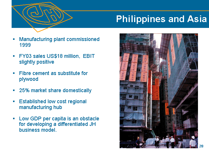 | Philippines and Asia Manufacturing plant commissioned 1999 FY03 sales US$18 million, EBIT slightly positive Fibre cement as substitute for plywood 25% market share domestically Established low cost regional manufacturing hub Low GDP per capita is an obstacle for developing a differentiated JH business model. |