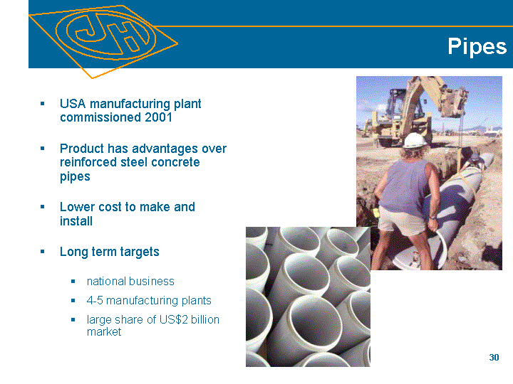 | USA manufacturing plant commissioned 2001 Product has advantages over reinforced steel concrete pipes Lower cost to make and install Long term targets national business 4-5 manufacturing plants large share of US$2 billion market Pipes |