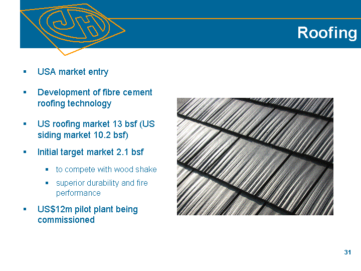 | Roofing USA market entry Development of fibre cement roofing technology US roofing market 13 bsf (US siding market 10.2 bsf) Initial target market 2.1 bsf to compete with wood shake superior durability and fire performance US$12m pilot plant being commissioned |