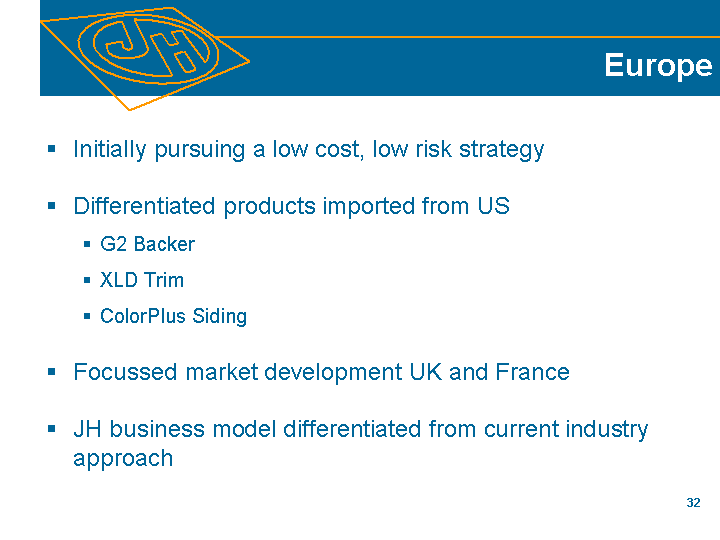 | Europe Initially pursuing a low cost, low risk strategy Differentiated products imported from US G2 Backer XLD Trim ColorPlus Siding Focussed market development UK and France JH business model differentiated from current industry approach |