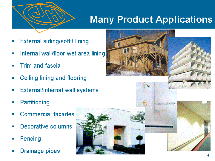 | Many Product Applications External siding/soffit lining Internal wall/floor wet area lining Trim and fascia Ceiling lining and flooring External/internal wall systems Partitioning Commercial facades Decorative columns Fencing Drainage pipes |