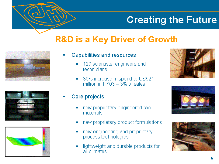 | Capabilities and resources 120 scientists, engineers and technicians 30% increase in spend to US$21 million in FY03 - 3% of sales Core projects new proprietary engineered raw materials new proprietary product formulations new engineering and proprietary process technologies lightweight and durable products for all climates Creating the Future R&D is a Key Driver of Growth |