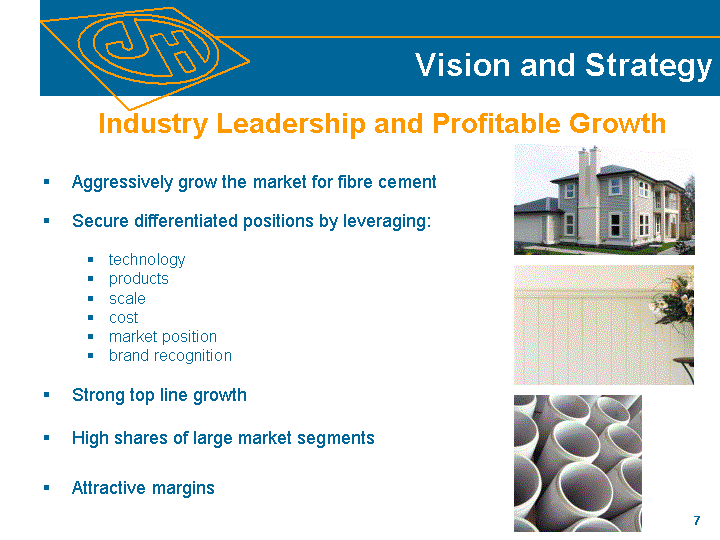 | Vision and Strategy Aggressively grow the market for fibre cement Secure differentiated positions by leveraging: technology products scale cost market position brand recognition Strong top line growth High shares of large market segments Attractive margins Industry Leadership and Profitable Growth |