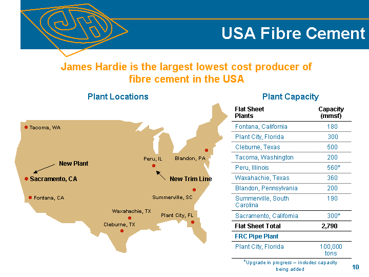 | USA Fibre Cement James Hardie is the largest lowest cost producer of fibre cement in the USA Plant Locations Flat Sheet Plants Capacity (mmsf) Fontana, California 180 Plant City, Florida 300 Cleburne, Texas 500 Tacoma, Washington 200 Peru, Illinois 560* Waxahachie, Texas 360 Blandon, Pennsylvania 200 Summerville, South Carolina 190 Sacramento, California 300* Flat Sheet Total 2,790 FRC Pipe Plant Plant City, Florida 100,000 tons Plant Capacity *Upgrade in progress - includes capacity being added Tacoma, WA Fontana, CA Plant City, FL Waxahachie, TX Cleburne, TX Peru, IL Blandon, PA Summerville, SC Sacramento, CA New Trim Line New Plant |