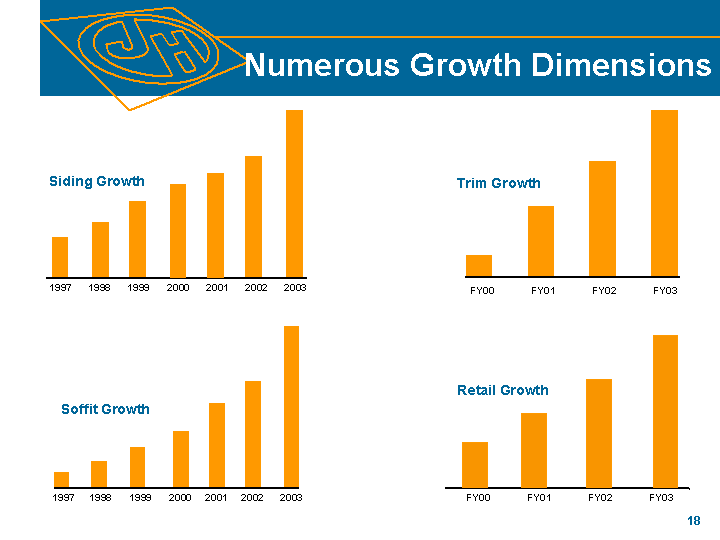 | Numerous Growth Dimensions Soffit Growth 1997 1998 1999 2000 2001 2002 2003 FY00 FY01 FY02 FY03 Retail Growth 1997 1998 1999 2000 2001 2002 2003 Siding Growth Trim Growth FY00 FY01 FY02 FY03 |