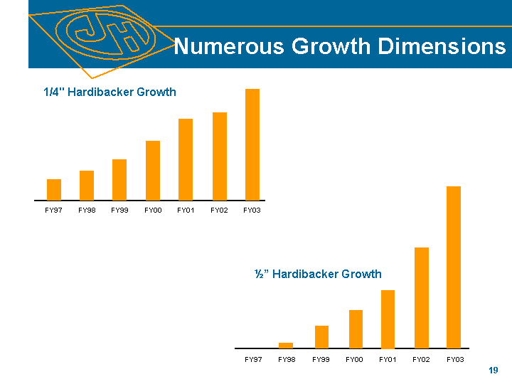 | Numerous Growth Dimensions 1/2" Hardibacker Growth FY97 FY98 FY99 FY00 FY01 FY02 FY03 1/4" Hardibacker Growth FY97 FY98 FY99 FY00 FY01 FY02 FY03 |