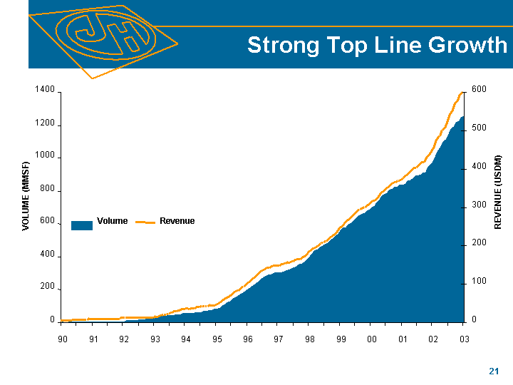 | Strong Top Line Growth 0 200 400 600 800 1000 1200 1400 90 91 92 93 94 95 96 97 98 99 00 01 02 03 VOLUME (MMSF) 0 100 200 300 400 500 600 REVENUE (USDM) Volume Revenue |