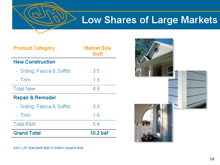 | Low Shares of Large Markets Product Category Market Size (bsf) New Construction - Siding, Fascia & Soffits 3.5 - Trim 1.3 Total New 4.8 Repair & Remodel - Siding, Fascia & Soffits 3.9 - Trim 1.6 Total R&R 5.4 Grand Total 10.2 bsf bsf = JH standard feet in billion square feet bsf = JH standard feet in billion square feet |