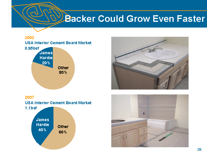| Backer Could Grow Even Faster 2002 USA Interior Cement Board Market 0.95bsf 2007 USA Interior Cement Board Market 1.1bsf James Hardie 20% Other 80% James Hardie 40% Other 60% |