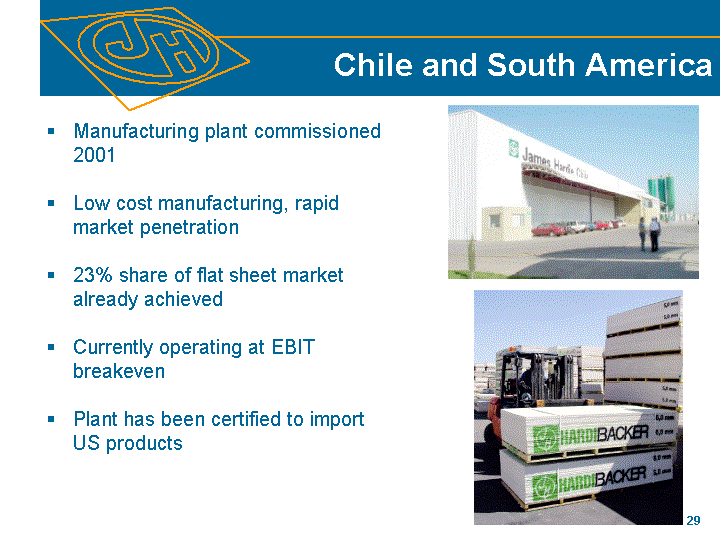 | Chile and South America Manufacturing plant commissioned 2001 Low cost manufacturing, rapid market penetration 23% share of flat sheet market already achieved Currently operating at EBIT breakeven Plant has been certified to import US products |