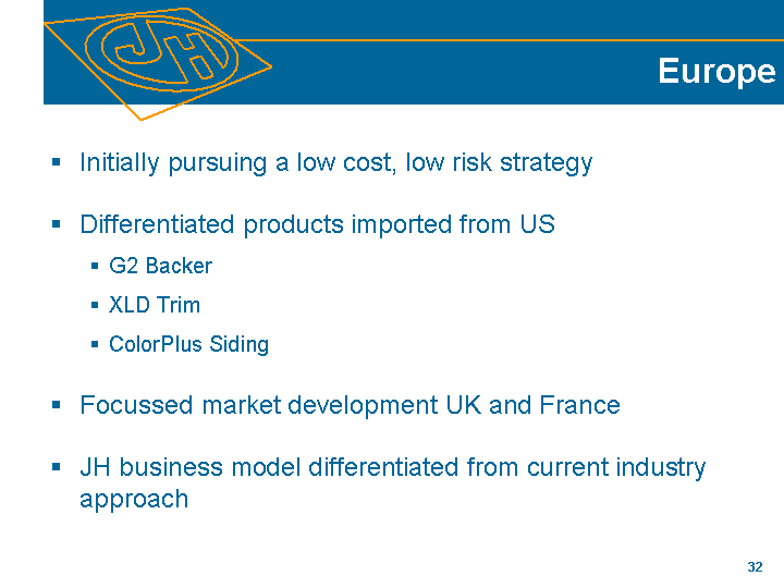| Europe Initially pursuing a low cost, low risk strategy Differentiated products imported from US G2 Backer XLD Trim ColorPlus Siding Focussed market development UK and France JH business model differentiated from current industry approach |