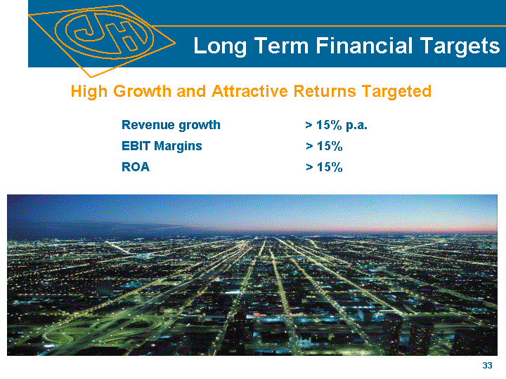 | Balanced Growth Portfolio James Hardie Business Portfolio - FY 03 GCE Sales EBIT USA - - Established high growth/high return 70% 75% 89% Asia Pacific - - Established high return 21% 24% 17% Other - - Emerging opportunities (Pipes, Roofing, Europe, Chile) 9% 1% (6%) Total 100% 100% 100% |