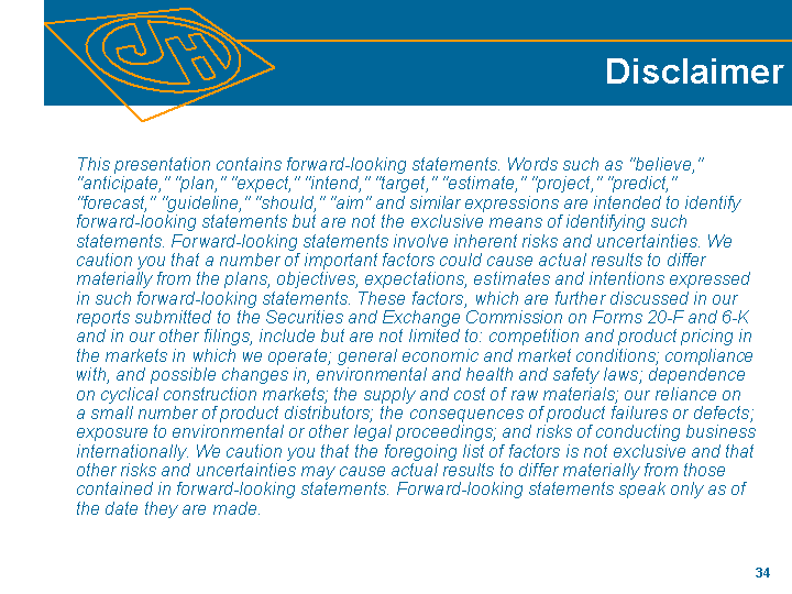 | Disclaimer This presentation contains forward-looking statements. Words such as "believe,'' "anticipate,'' "plan,'' "expect,'' "intend,'' "target,'' "estimate,'' "project,'' "predict,'' "forecast,'' "guideline,'' "should,'' "aim'' and similar expressions are intended to identify forward-looking statements but are not the exclusive means of identifying such statements. Forward-looking statements involve inherent risks and uncertainties. We caution you that a number of important factors could cause actual results to differ materially from the plans, objectives, expectations, estimates and intentions expressed in such forward-looking statements. These factors, which are further discussed in our reports submitted to the Securities and Exchange Commission on Forms 20-F and 6-K and in our other filings, include but are not limited to: competition and product pricing in the markets in which we operate; general economic and market conditions; compliance with, and possible changes in, environmental and health and safety laws; dependence on cyclical construction markets; the supply and cost of raw materials; our reliance on a small number of product distributors; the consequences of product failures or defects; exposure to environmental or other legal proceedings; and risks of conducting business internationally. We caution you that the foregoing list of factors is not exclusive and that other risks and uncertainties may cause actual results to differ materially from those contained in forward-looking statements. Forward-looking statements speak only as of the date they are made. |