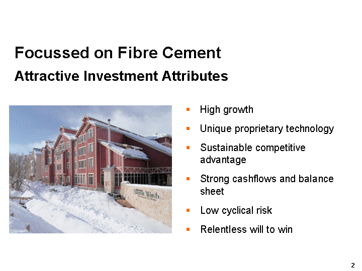 | Focussed on Fibre Cement High growth Unique proprietary technology Sustainable competitive advantage Strong cashflows and balance sheet Low cyclical risk Relentless will to win Attractive Investment Attributes |