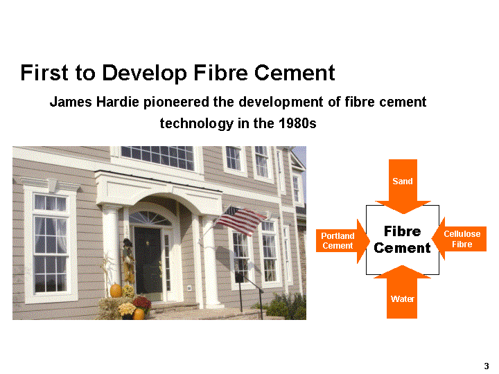 | First to Develop Fibre Cement James Hardie pioneered the development of fibre cement technology in the 1980s Fibre Cement Sand Cellulose Fibre Water Portland Cement |