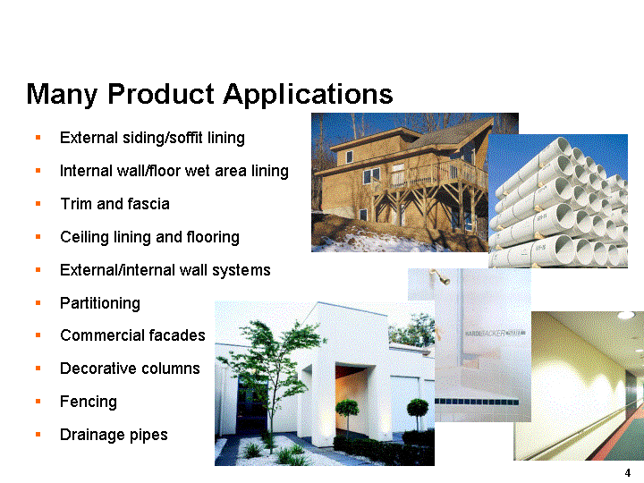 | Many Product Applications External siding/soffit lining Internal wall/floor wet area lining Trim and fascia Ceiling lining and flooring External/internal wall systems Partitioning Commercial facades Decorative columns Fencing Drainage pipes |