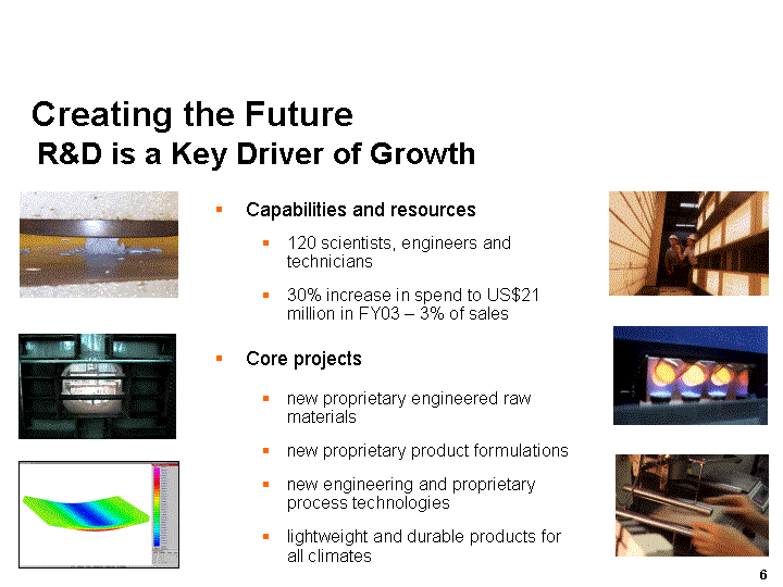 | Capabilities and resources 120 scientists, engineers and technicians 30% increase in spend to US$21 million in FY03 - 3% of sales Core projects new proprietary engineered raw materials new proprietary product formulations new engineering and proprietary process technologies lightweight and durable products for all climates Creating the Future R&D is a Key Driver of Growth |