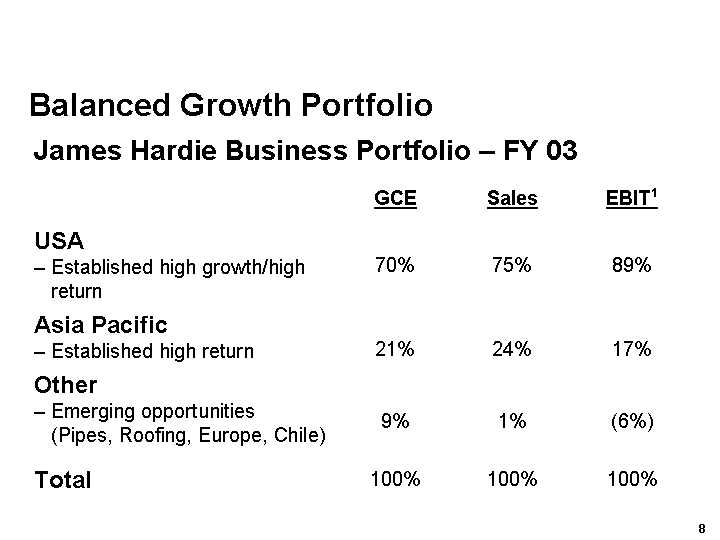 | Balanced Growth Portfolio James Hardie Business Portfolio - FY 03 GCE Sales EBIT1 USA - - Established high growth/high return 70% 75% 89% Asia Pacific - - Established high return 21% 24% 17% Other - - Emerging opportunities (Pipes, Roofing, Europe, Chile) 9% 1% (6%) Total 100% 100% 100% |