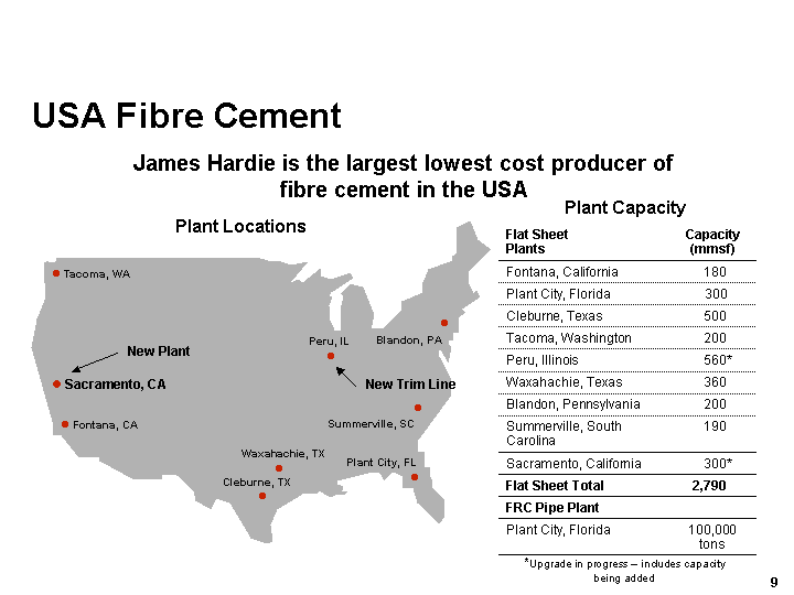 | USA Fibre Cement James Hardie is the largest lowest cost producer of fibre cement in the USA Plant Locations Flat Sheet Plants Capacity (mmsf) Fontana, California 180 Plant City, Florida 300 Cleburne, Texas 500 Tacoma, Washington 200 Peru, Illinois 560* Waxahachie, Texas 360 Blandon, Pennsylvania 200 Summerville, South Carolina 190 Sacramento, California 300* Flat Sheet Total 2,790 FRC Pipe Plant Plant City, Florida 100,000 tons Plant Capacity *Upgrade in progress - includes capacity being added Tacoma, WA Fontana, CA Plant City, FL Waxahachie, TX Cleburne, TX Peru, IL Blandon, PA Summerville, SC Sacramento, CA New Trim Line New Plant |