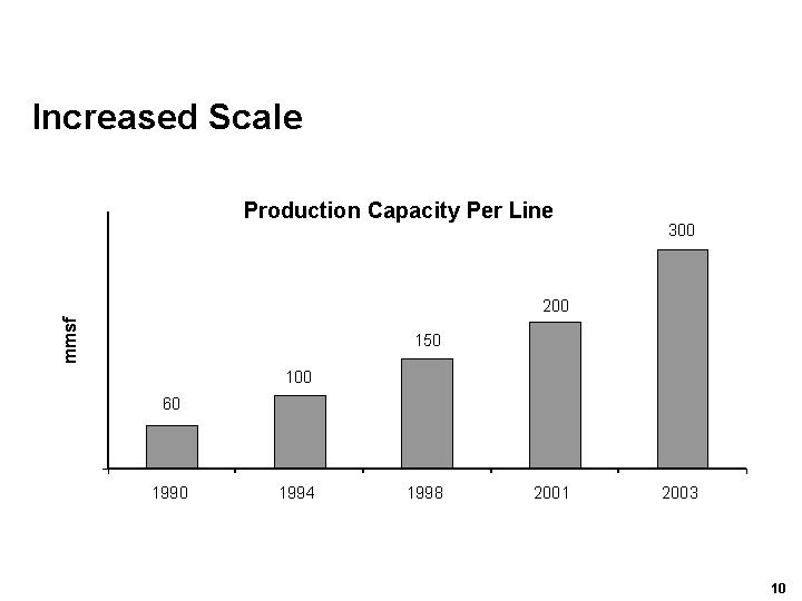 | Increased Scale 1990 1994 1998 2001 2003 mmsf 60 100 150 200 300 Production Capacity Per Line |