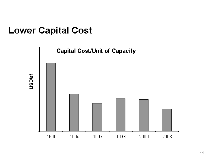 | Lower Capital Cost 1990 1995 1997 1998 2000 2003 USD/sf Capital Cost/Unit of Capacity |