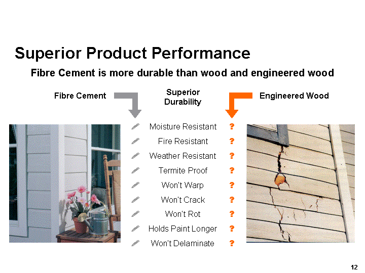 | Superior Product Performance Fibre Cement is more durable than wood and engineered wood Fibre Cement Superior Durability Moisture Resistant Fire Resistant Weather Resistant Termite Proof Won't Warp Won't Crack Won't Rot Holds Paint Longer Won't Delaminate ? ? ? ? ? ? ? ? ? ? ? ? ? ? ? ? ? ? Engineered Wood |