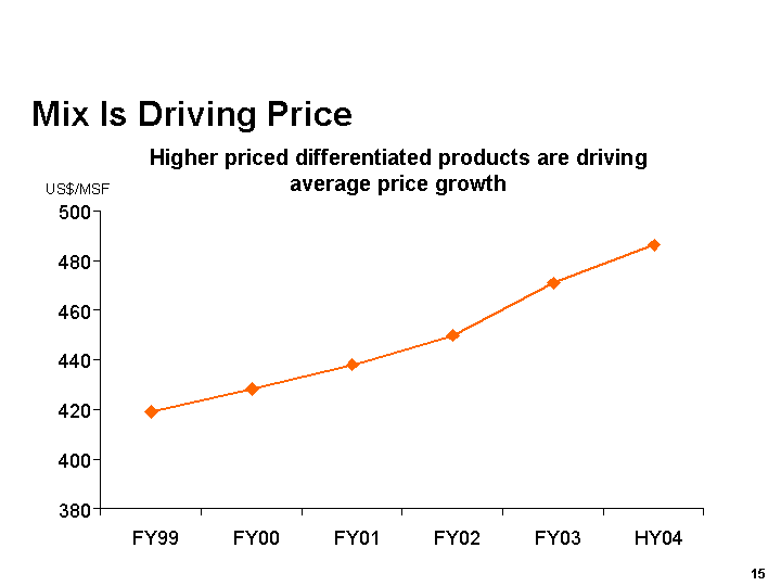 | Higher priced differentiated products are driving average price growth Mix Is Driving Price 380 400 420 440 460 480 500 FY99 FY00 FY01 FY02 FY03 HY04 US$/MSF |