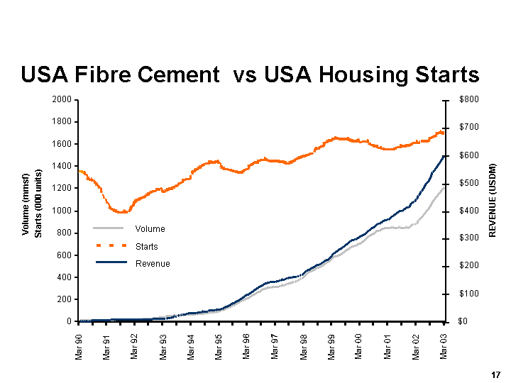 | USA Fibre Cement vs USA Housing Starts 0 200 400 600 800 1000 1200 1400 1600 1800 2000 Mar 90 Mar 91 Mar 92 Mar 93 Mar 94 Mar 95 Mar 96 Mar 97 Mar 98 Mar 99 Mar 00 Mar 01 Mar 02 Mar 03 Volume (mmsf) Starts (000 units) $0 $100 $200 $300 $400 $500 $600 $700 $800 REVENUE (USDM) Volume Starts Revenue |