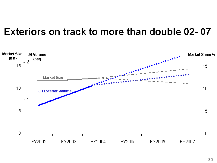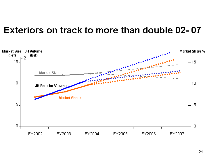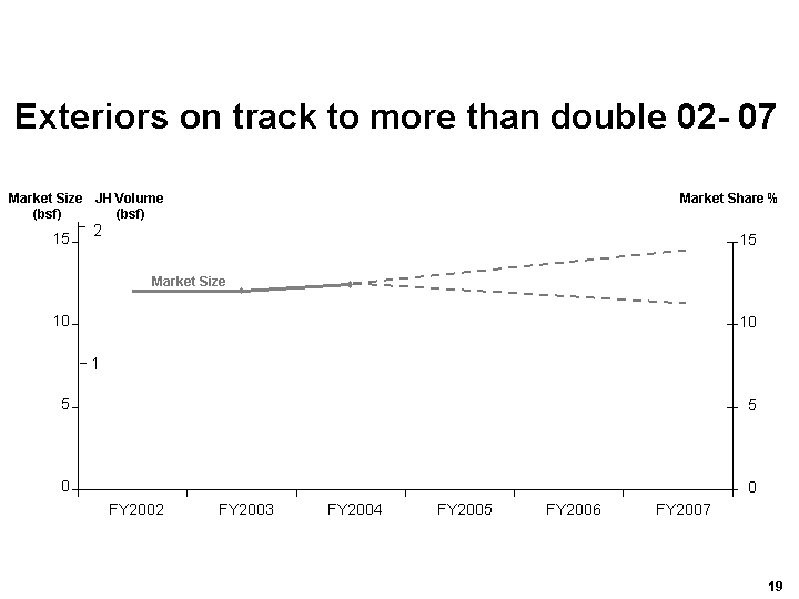 | Exteriors on track to more than double 02- 07 Market Size (bsf) Market Share % 0 5 10 15 FY2002 FY2003 FY2004 FY2005 FY2006 FY2007 0 5 10 15 Market Size 1 2 JH Volume (bsf) |