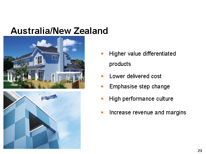 | Australia/New Zealand Higher value differentiated products Lower delivered cost Emphasise step change High performance culture Increase revenue and margins |