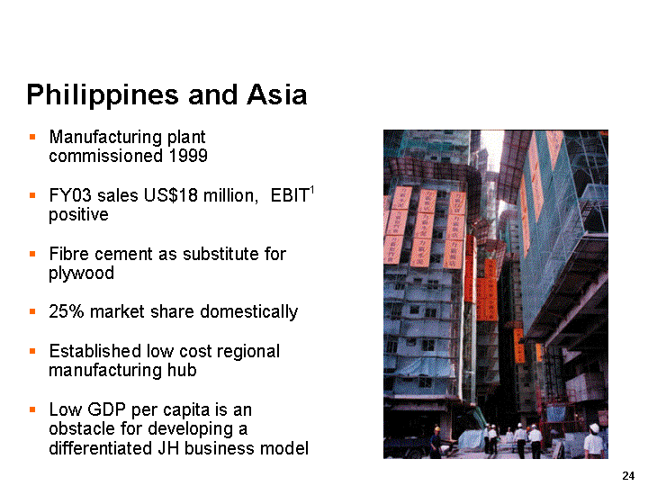 | Philippines and Asia Manufacturing plant commissioned 1999 FY03 sales US$18 million, EBIT1 positive Fibre cement as substitute for plywood 25% market share domestically Established low cost regional manufacturing hub Low GDP per capita is an obstacle for developing a differentiated JH business model |